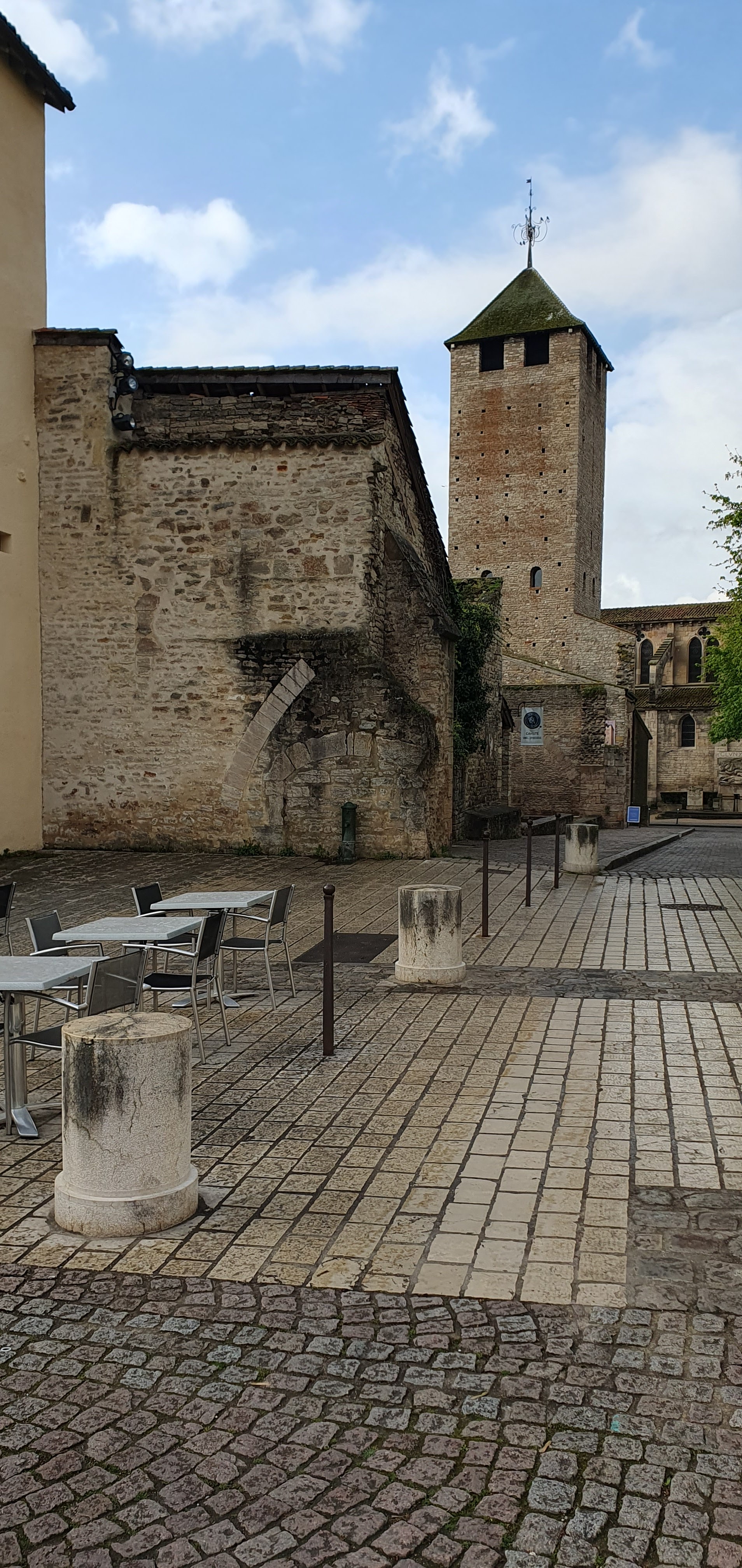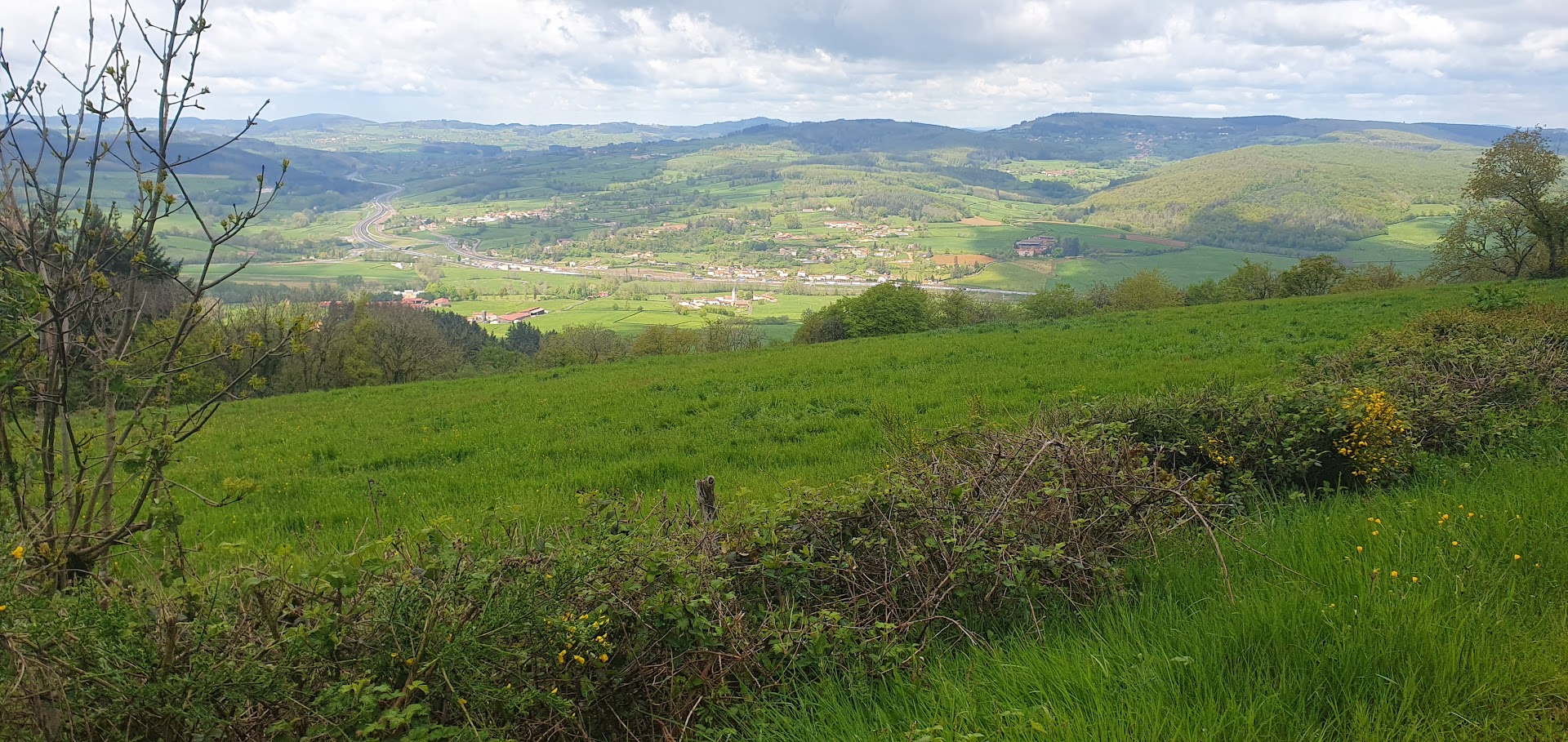 Na een traditioneel Frans ontbijt(je) hebben we iets van de abdij bekeken. Dit is het begin van onze wandeltocht, vandaag zo'n 19 km zonder echte beklimmingen en afdalingen. De verwachting was: hele dag lichte regen, maar dat viel mee. Regen hebben we niet gehad, maar wel hagel die overging in sneeuw! De brem staat hier vol in bloei, veel bloemen ook, en zelf prachtige grote bloeiende bomen, wat je niet zou verwachten op 600m hoogte aan de rand van het bos.