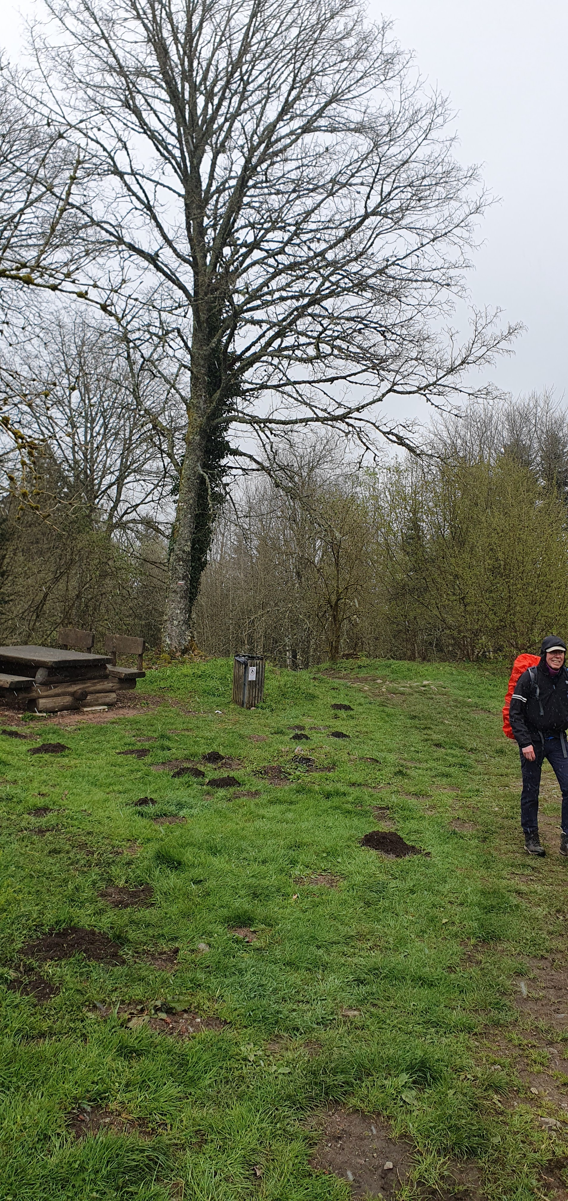 Zo, dat was een pittige etappe vandaag. Via een heilzame bron over de waterscheiding Atlantic-Meditairané gelopen en de 1000m hoogte aangetikt. Op de uitkijktoren het filmpje gemaakt. Hier waren we niet alleen: een viertal hardlopers (m/v) hadden de top ook als doel. Geen lunchinkopen vanochtend, dus we mochten even genieten van een lekkere salade. Timing was goed: tijdens een regenbui. Niet dat we het helemaal droog hebben gehouden, maar zelfs met wat sneeuw mocht het verder geen naam hebben. Ook voor het eerst deze tocht een bordje gemist en 3km extra gelopen, we geven de houtvesters de schuld! Vanavond een Vietnamees diner (daarvoor hoef je niet naar Vietnam 😉): zou weleens gezellig kunnen worden. Maar nu eerst een douche en een welverdiende pression.