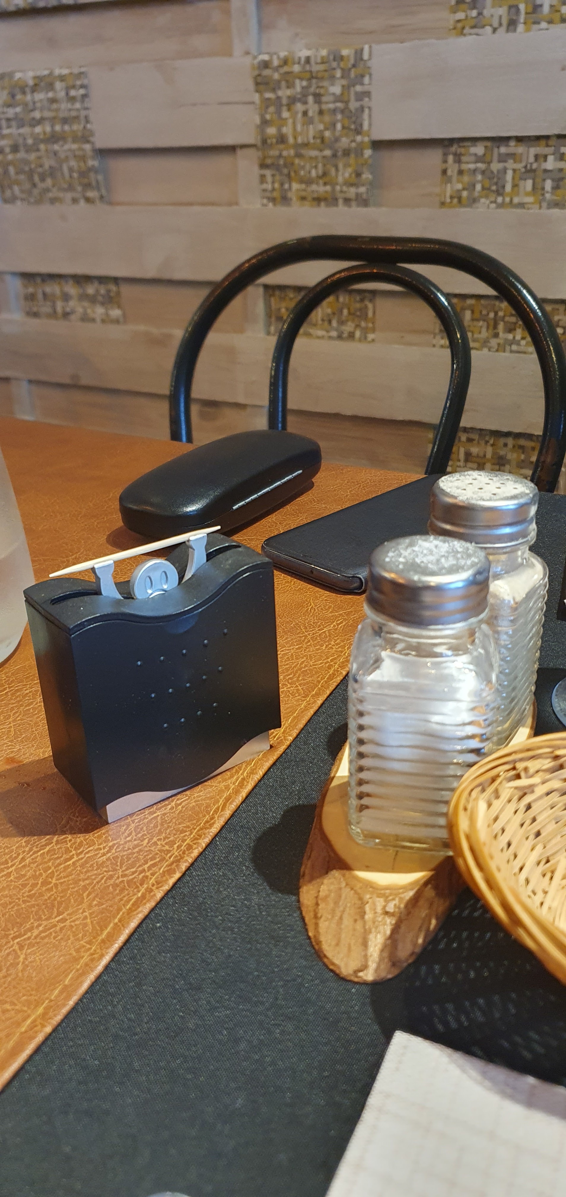 Aangekomen in Usson-en-Forez begon het toch te regenen. Een goed excuus voor een uitgebreide lunch, dit keer met een wijntje. Droog zou het toch niet weer worden en we hadden nog maar 5km voor de boeg. Leuk is nog wel de houder voor de tandenstokers (foto).