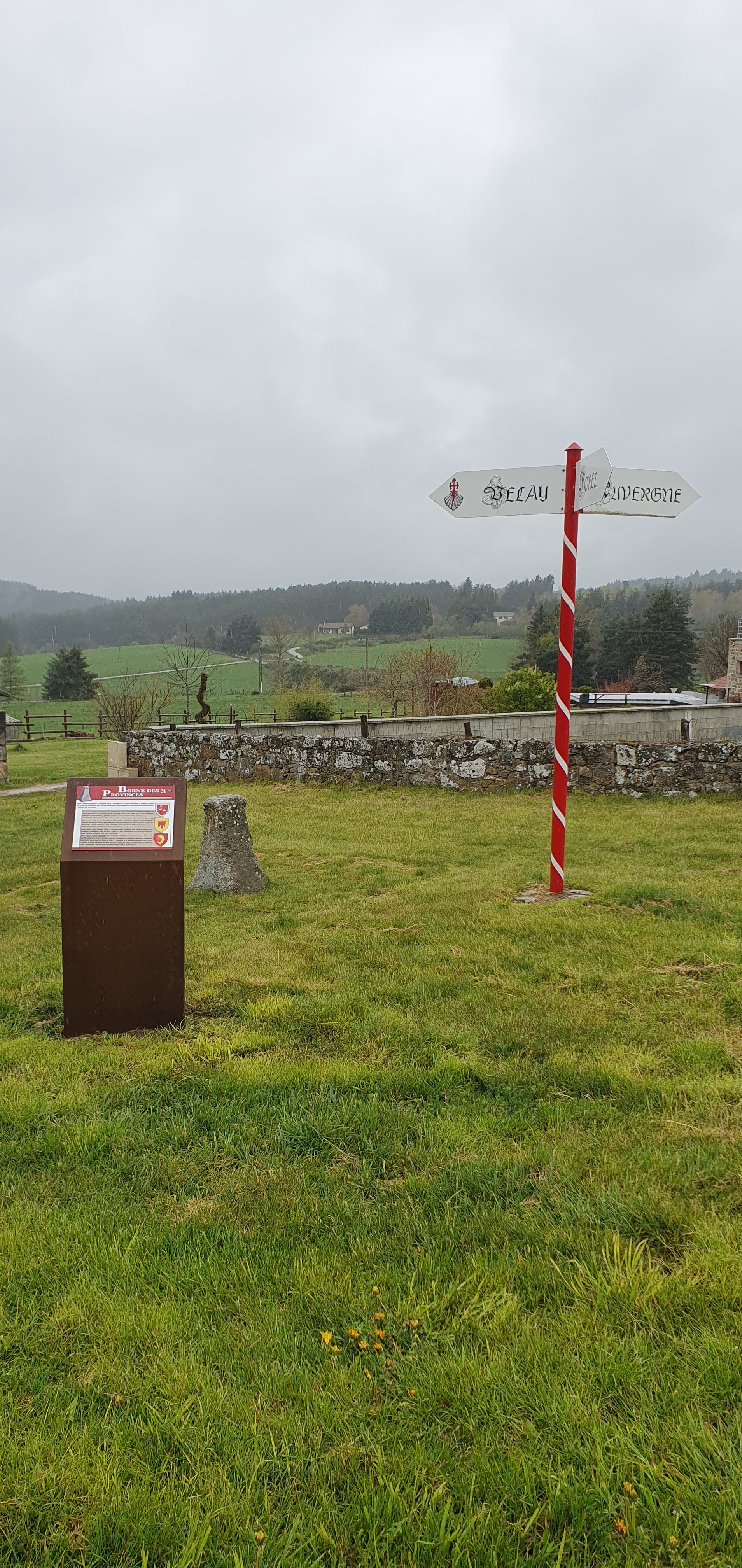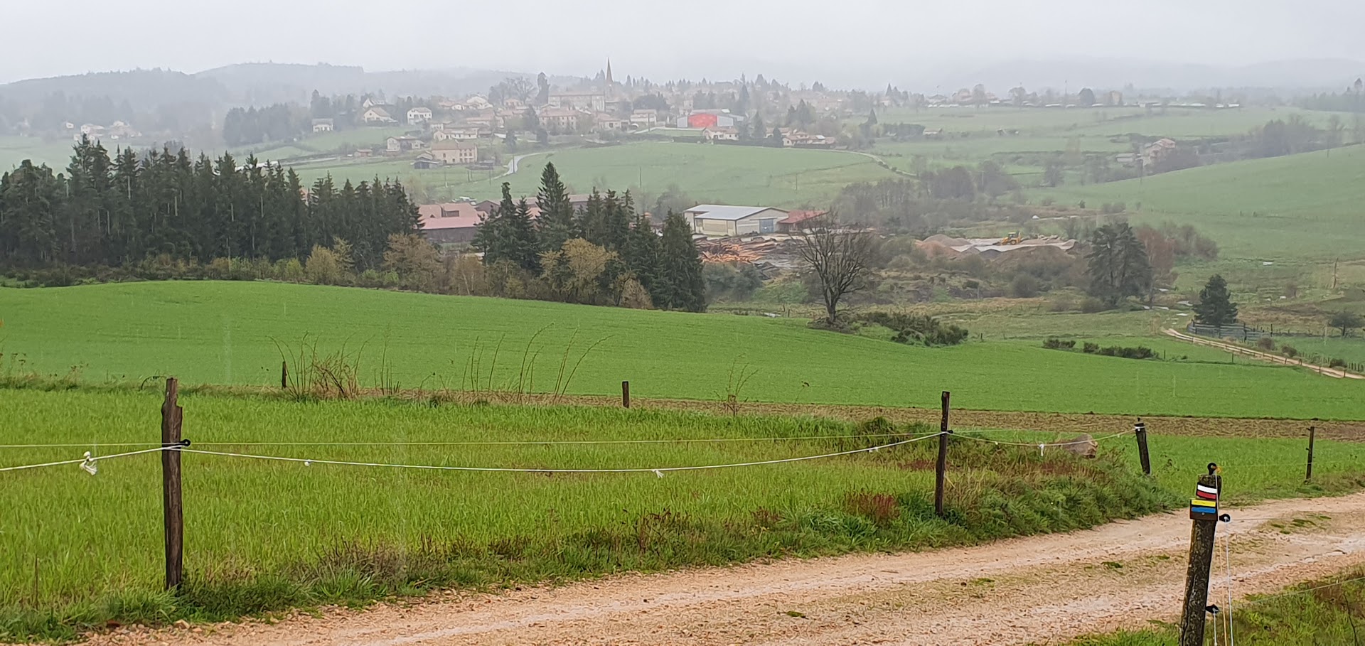 Het stadje uitlopend kwamen we langs een "drie-landen" punt (foto). Daarna nog een plaatje in de regen van Usson-en-Forez.
