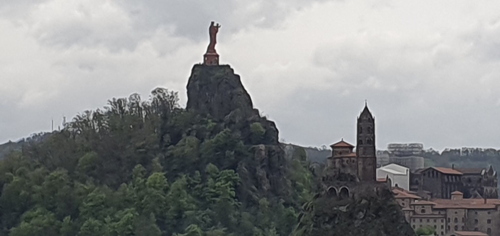 In Le Puy torend het Mariabeeld hoog boven de stad uit. We zijn maar niet naar boven geklommen, naar de cathedraal was al hoog genoeg. Dit hebben we als eindstation gemarkeerd, getuige de foto met ons tweeën!