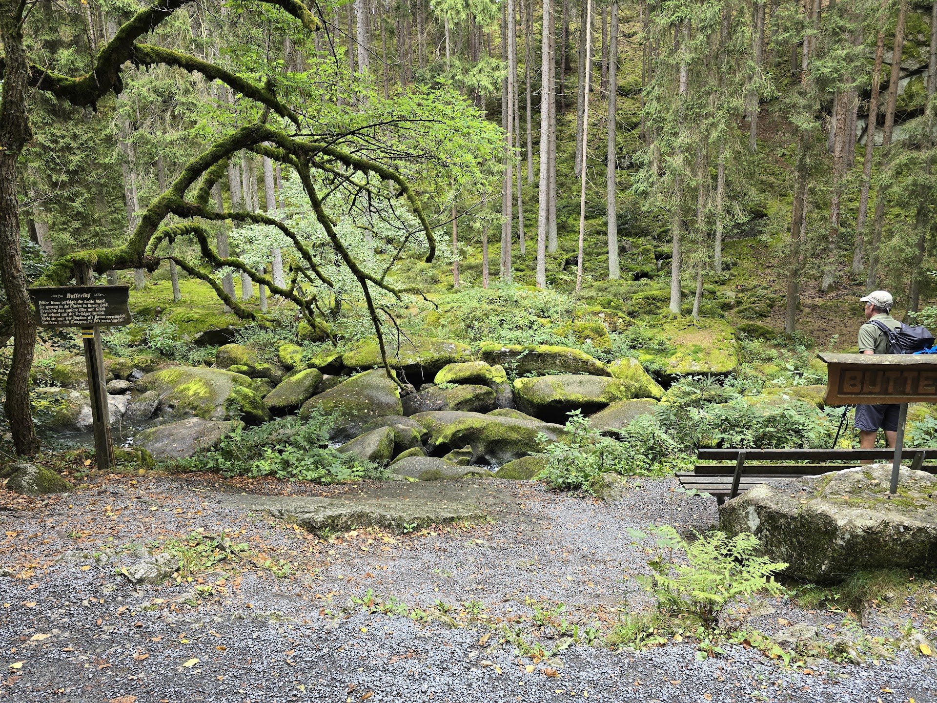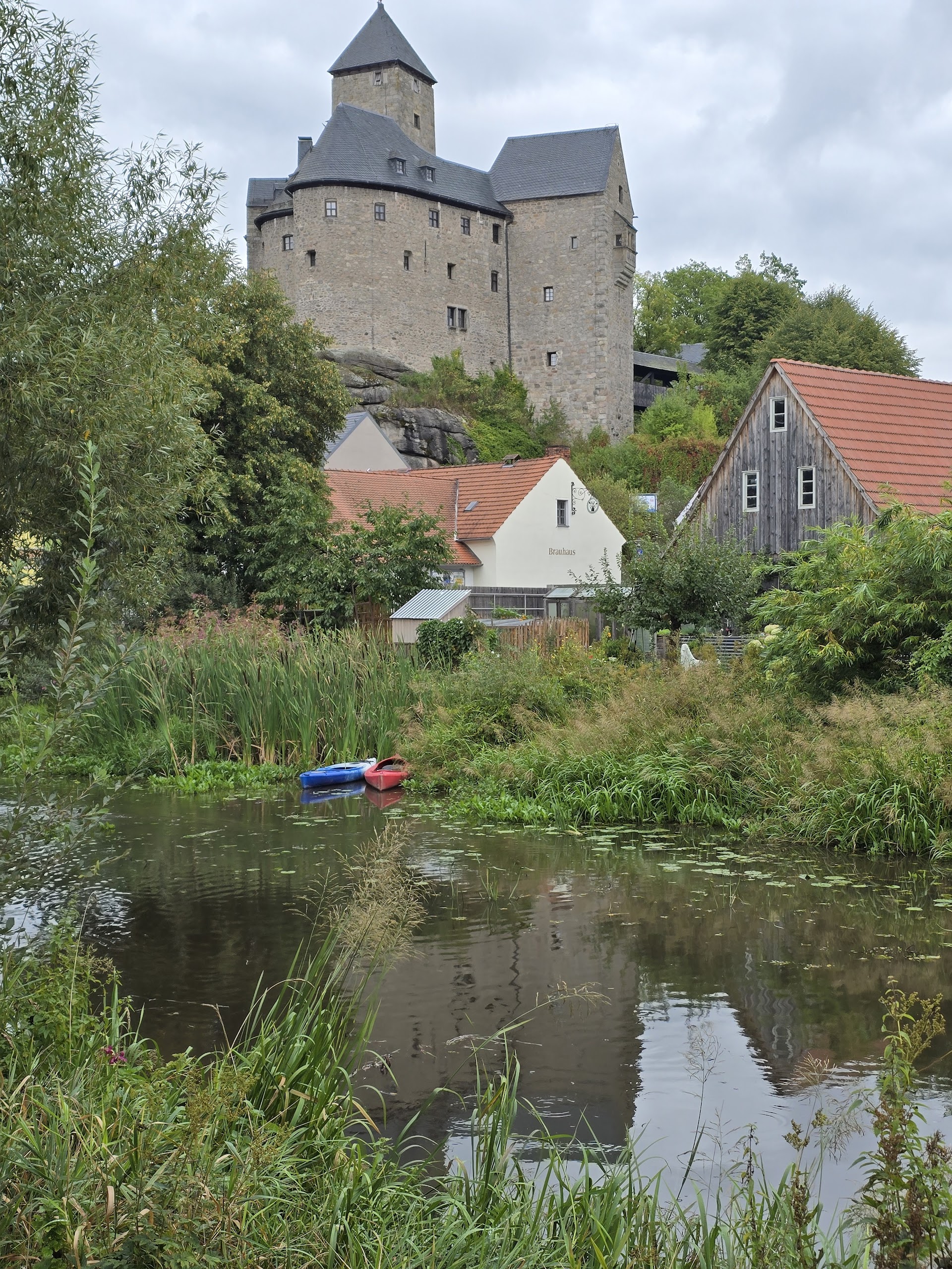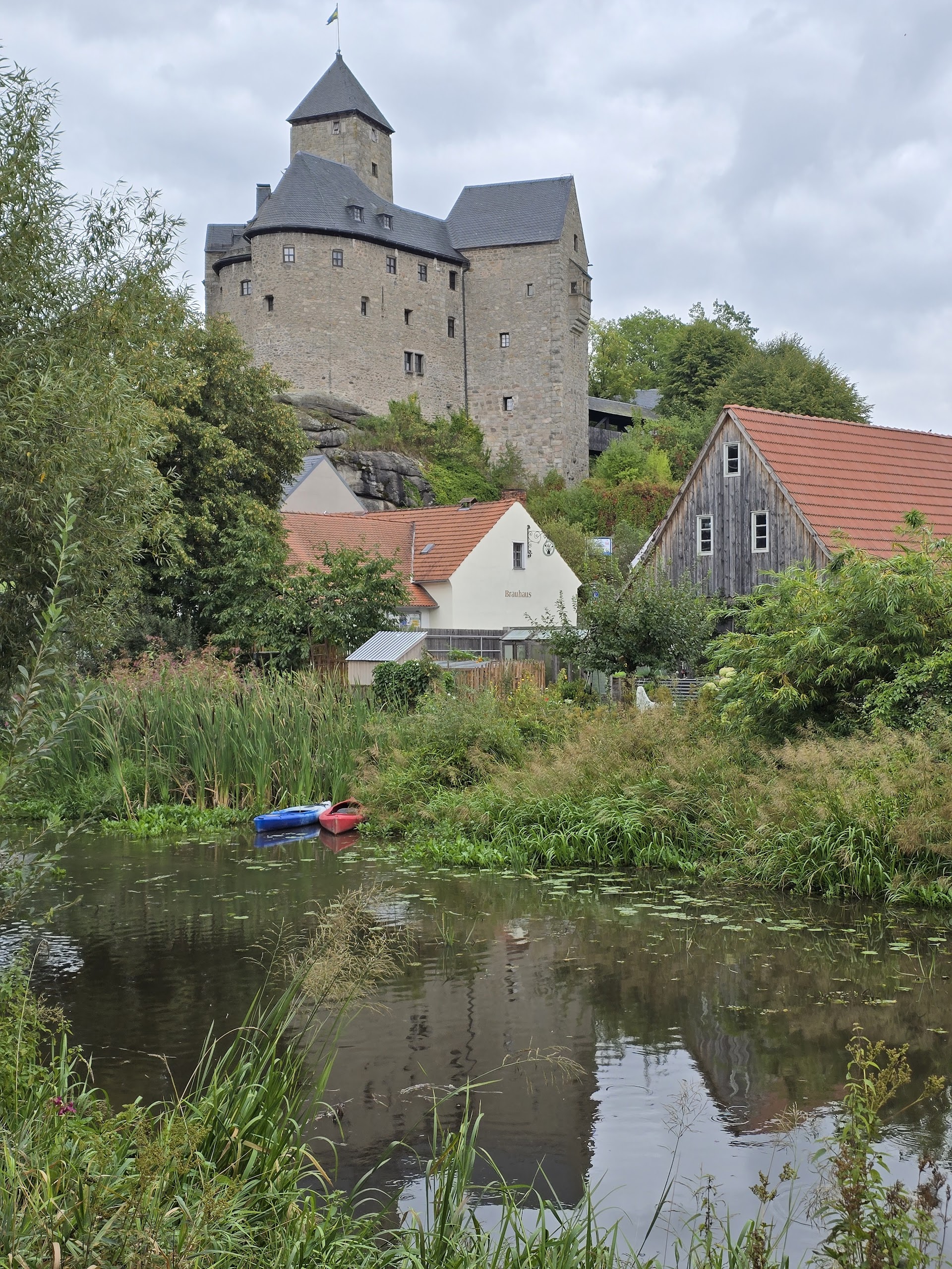 Van een bijzonder hotel naar een bijzonder mooie etappe. Gelijk een paar reetjes gespot (eerste foto) bij de karpervijvers, ofwel dijkenland. Daarna een stukje naar Falkenberg, onze koffie stop. Het kasteel, op de foto, hebben we niet bezichtigd, omdat we toe waren aan koffie. Het werd wederom een koffiestop zonder koffie, een hard gelag voor Nico. Het tweede deel van de bijna 26km lange etappe was bijzonder mooi. Het Waldnaab-tal doet denken aan klein-Zwitserland in Luxemburg, maar de route liep langs de rivier, wat het nog mooier maakt. Een hut onderweg, op een mooie locatie, was niet meer in gebruik maar een prima stop. Weinig hoogtemeters vandaag: zo'n 176m, meer gedaald dan gestegen. Het dreigde een regenachtige dag te worden, maar dat viel mee. Op een paar spatjes na hebben we het droog gehouden, ondanks de dreigementen op buienradar. De verrassing van vandaag was dat we de eerste wandelaars tegenkwamen die ook de hele Goldsteig lopen. We hadden al even gedacht dat we de enigen waren!