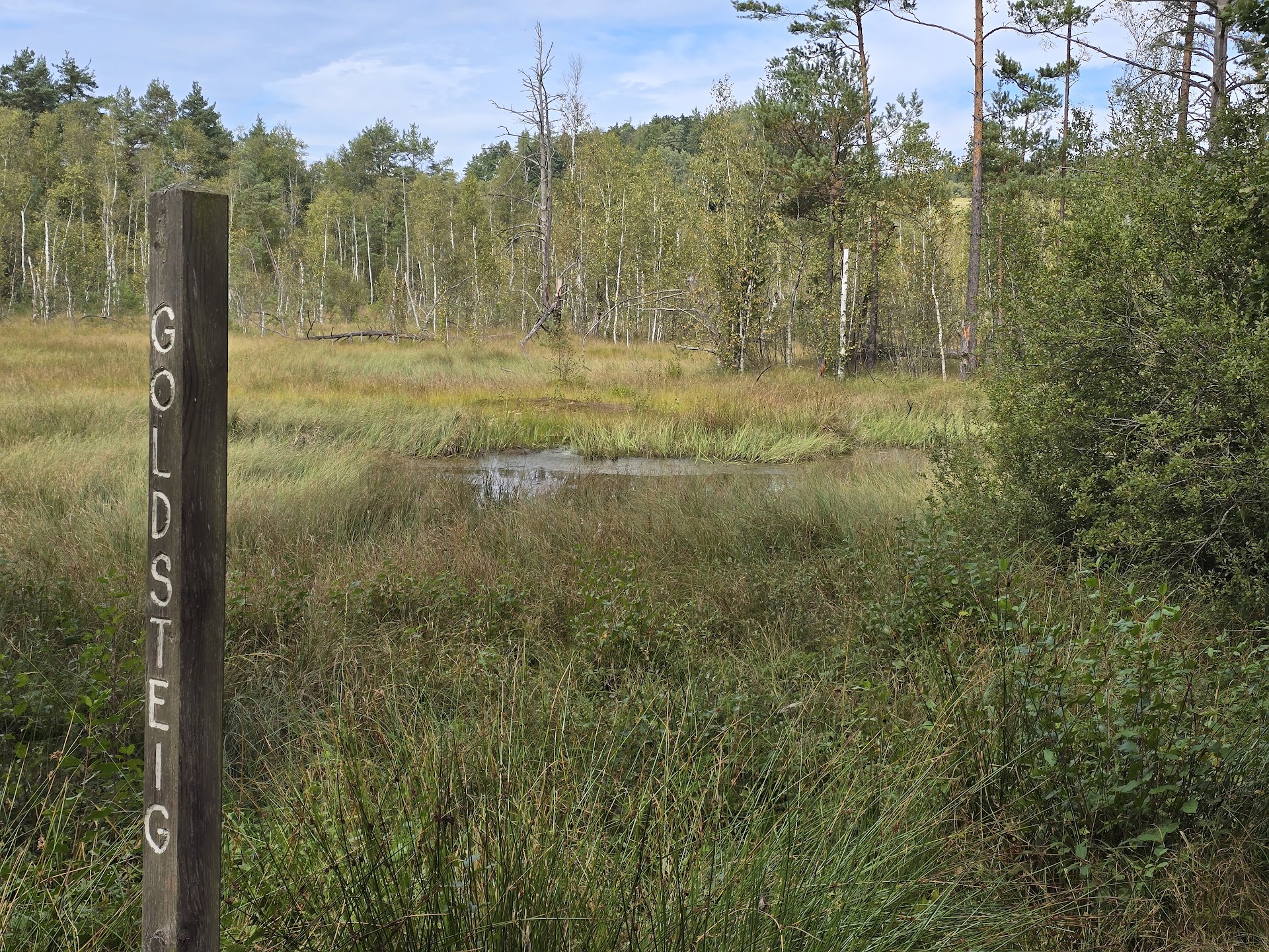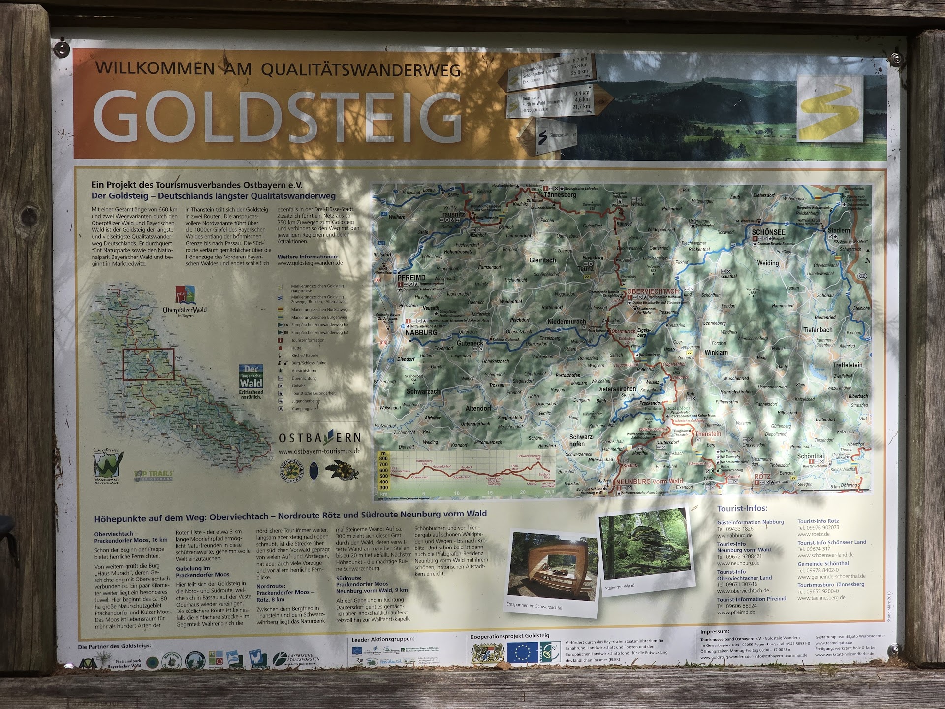 Vandaag weer een mooie etappe van ruim 26km en 580 hoogtemeters. Het waren mooie bospaden afgewisseld met mooie vergezichten. In het begin de burcht van Obermurach, zie foto, later op de route een mooi veengebied annex moeras. Zoiets waren we nog niet tegengekomen. Daarna een markant punt: de splitsing van de Goldsteig in de noord-route (nog 280km) en de zuid-route (235km). Daar hebben we geluncht en niet getwijfeld: we nemen de noord-route! Nu aangekomen in Grassersdorf voor ons vaste ritueel.