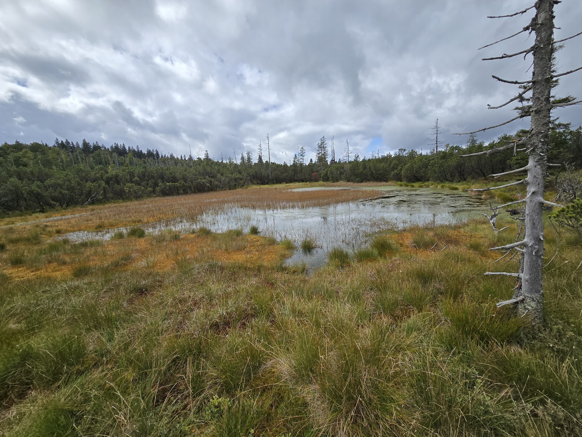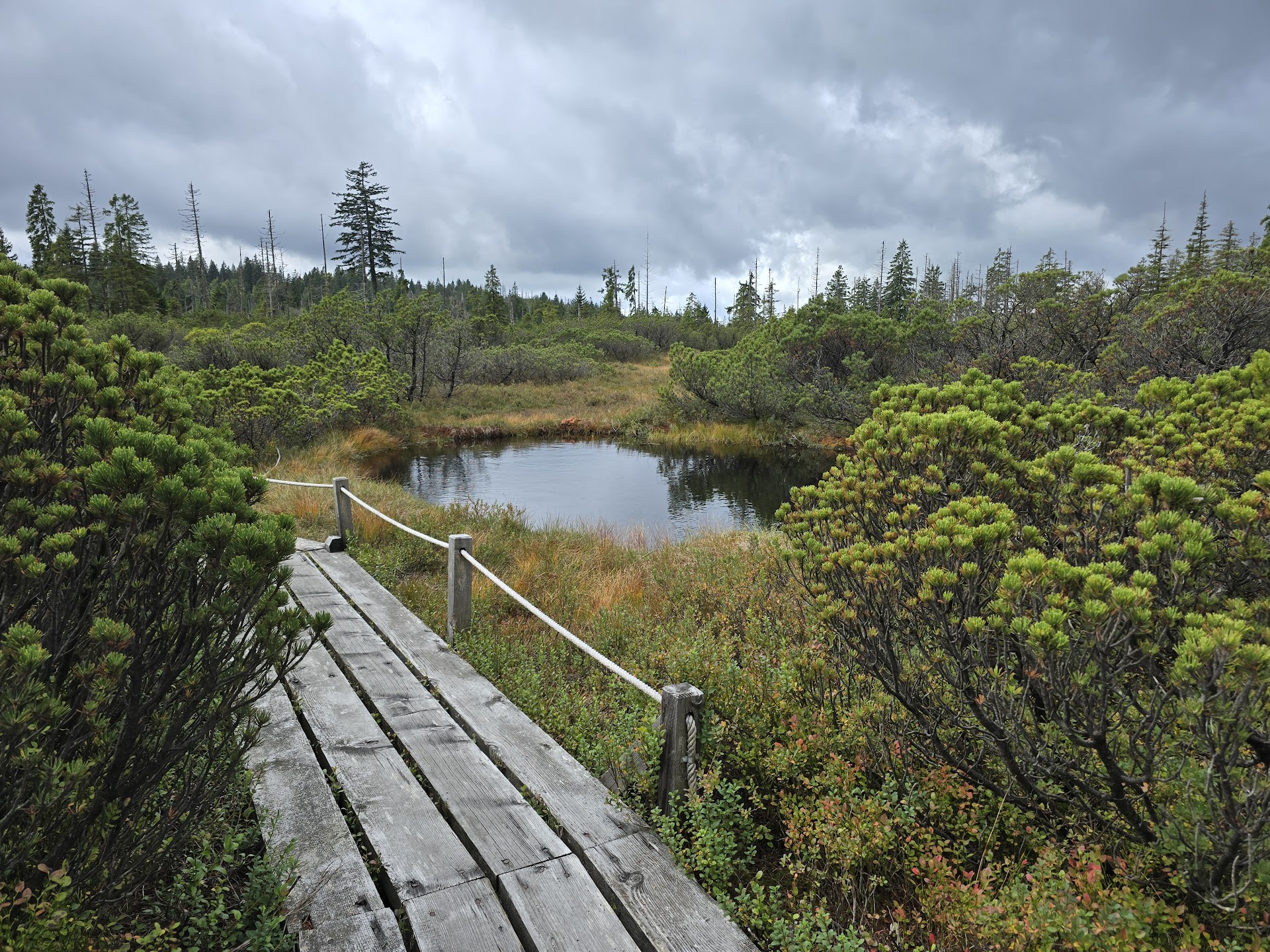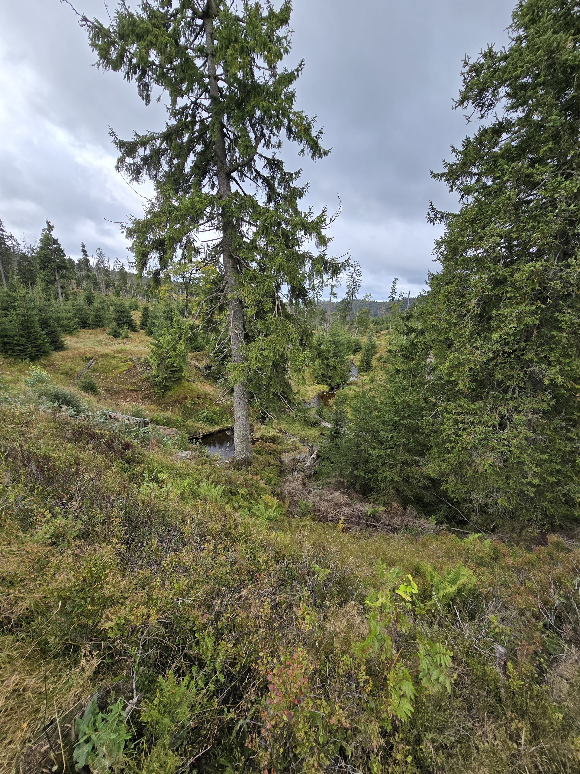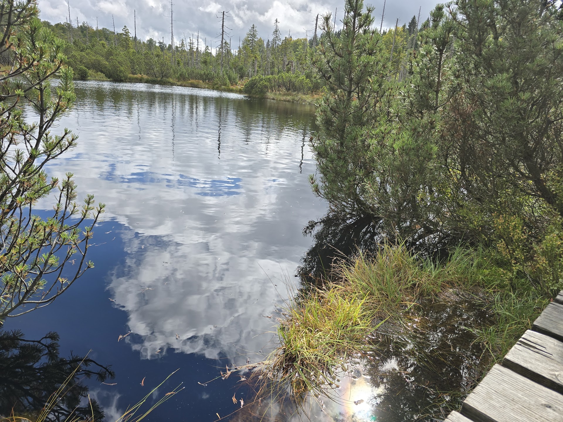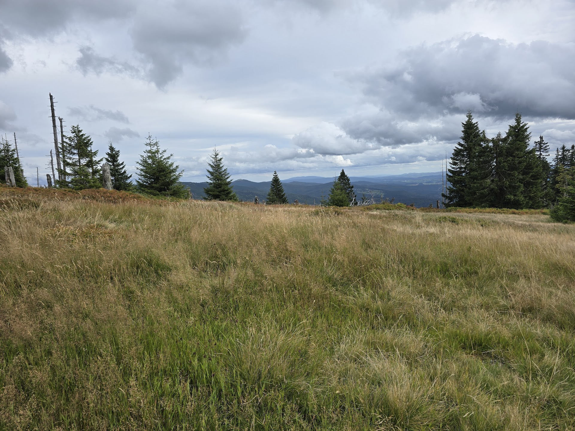 Vandaag de koninginne-etappe met fris weer en behoorlijk wat wind. Gelukkig wel mooie uitzichten en verschillende stukken natuur. De schade van de Borkerkäfer is goed zichtbaar, met deze wind zelfs omvallende bomen! Ook veel loofbos met veel beuken. Het mooiste deel was een hoogveengebied/moeras met aangelegde houten vlonders. Wel oppassen, want het nette hout kon erg glad zijn. Daarna een flinke/lastige klim met een mooi uitzicht naar beneden (af en toe een kabel nodig) richting de "Waldschuthütte", jammer dat die wordt gerenoveerd! Dus we mochten vanaf de hut nog een afdaling doen en de bus naar Spiegelau nemen voor onze overnachting in pension "Waldblick". Zo'n 30km met toch nog 790 hoogtemeters.