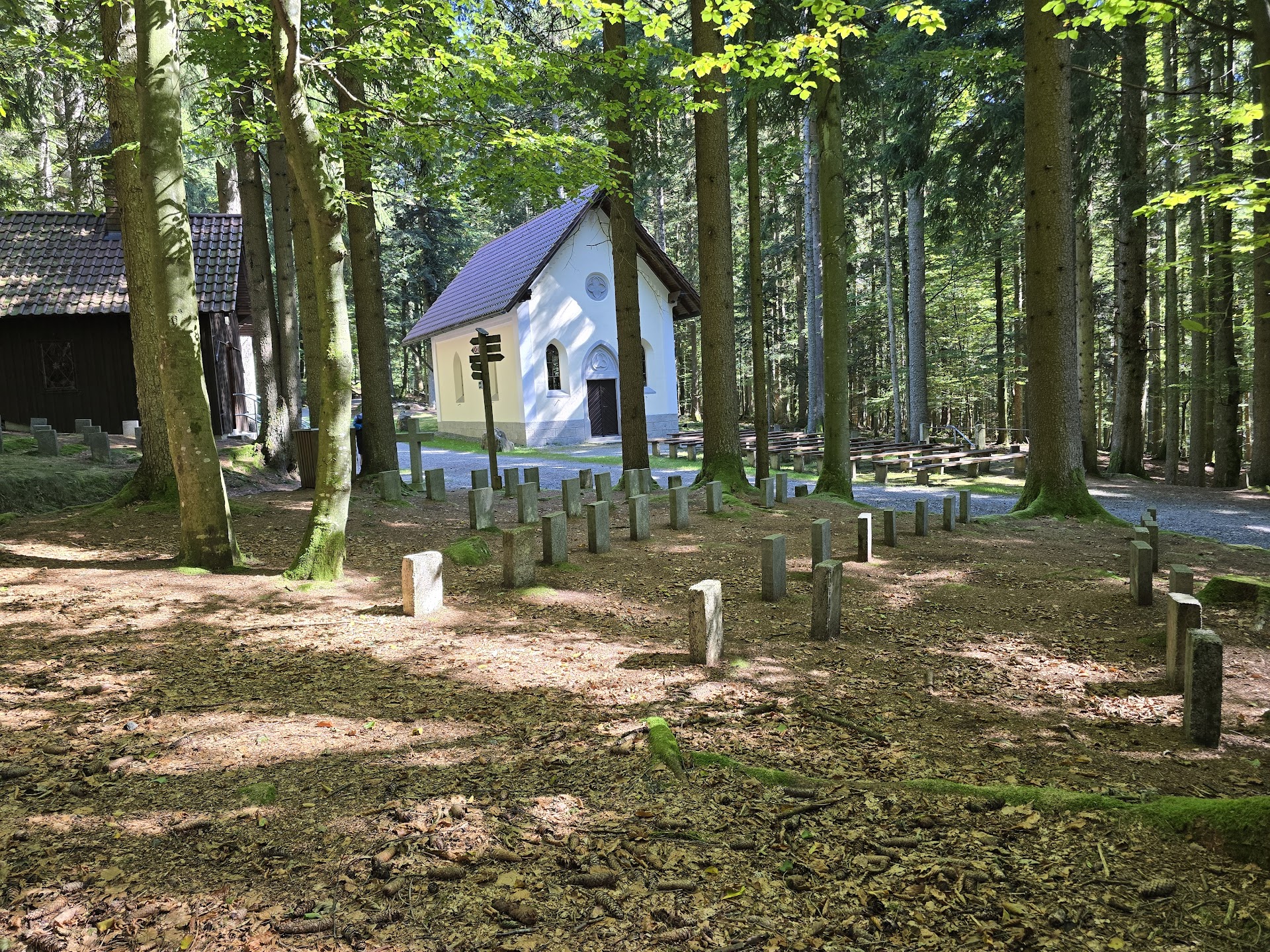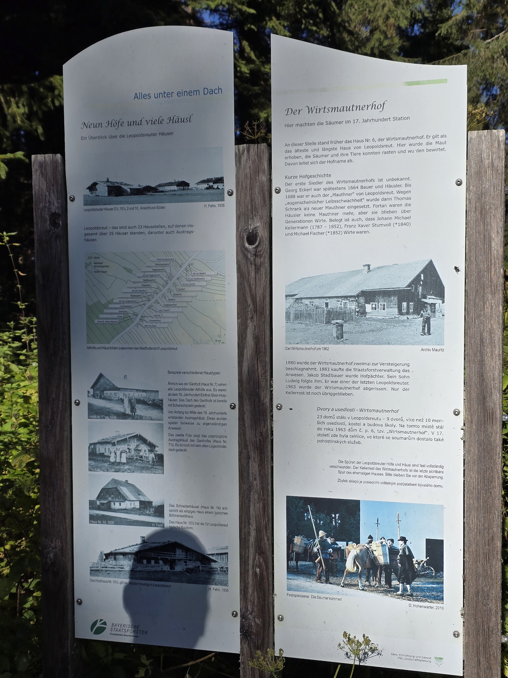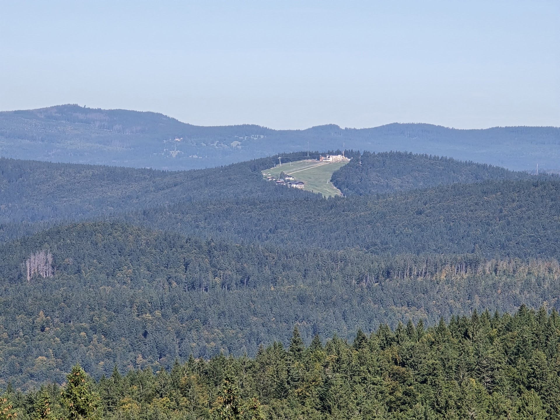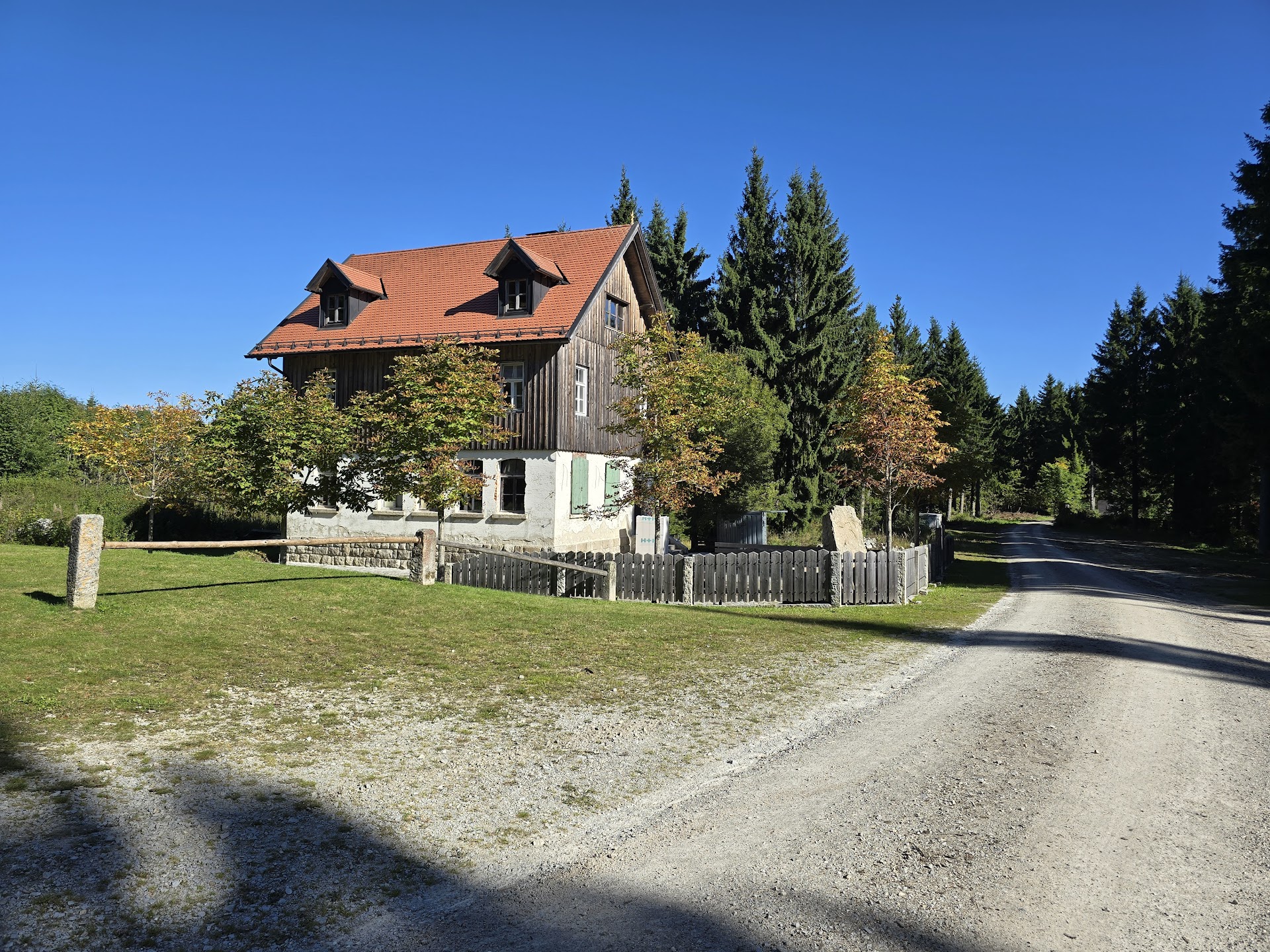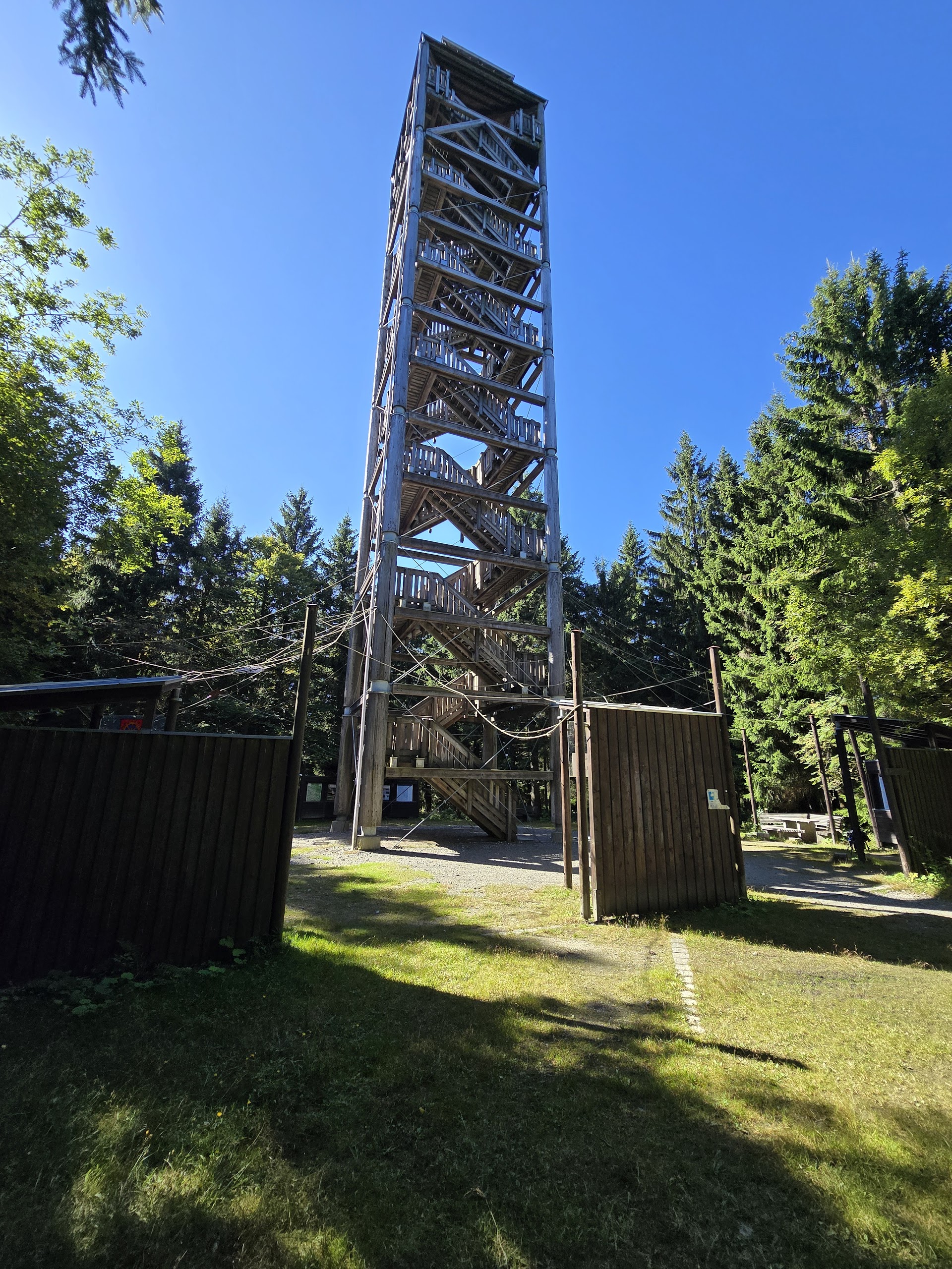 Een lange etappe vandaag met een strak blauwe lucht en warm weer. Tijd voor zonnebrand! Dat voelt weer eens anders: 28km met 470 hoogtemeters en 26C aan het eind. Bij het vertrek vanaf Alpe was het, voor het eerst, gelijk zonnig! Afwisselende route, voor het gemak eens veel over Waldwege, dus berijdbaar, met veel kiezel. Hoogtepunten waren Leopoldsreuth, een voormalig dorp aan de Golden Steig, waar de kerk en het schoolgebouw nog bestonden. Alle huizen waren verdwenen, maar de sporen waren er nog wel. Nog wel een vakantiehuisje van iemand uit München, oorspronkelijk Düsseldorf. Die begon in het Engels omdat hij ons Nederlands accent herkende 🤔 Daarna bergop naar de Haidel met een uitkijktoren van 30m hoog. Nico heeft de moed verzameld om er toch op te klimmen: een heel stevige toren met een schitterend uitzicht. Wederom zicht op de Alpen (filmpje). De Kohlstattbrunn, een dubbele kapel met bron erbij werd onze lunchplek. Daarna verder, ondermeer langs een Trifft Kanal, naar de oorsprong van de Kalte Moldau. Dus over de waterscheiding van de Donau en de Elbe. Vandaag overnachten we in een pension met terras op het westen. Lang zullen we er niet zitten: geen bier! Daarvoor moeten we nog wel 1,5km lopen (en weer terug)!